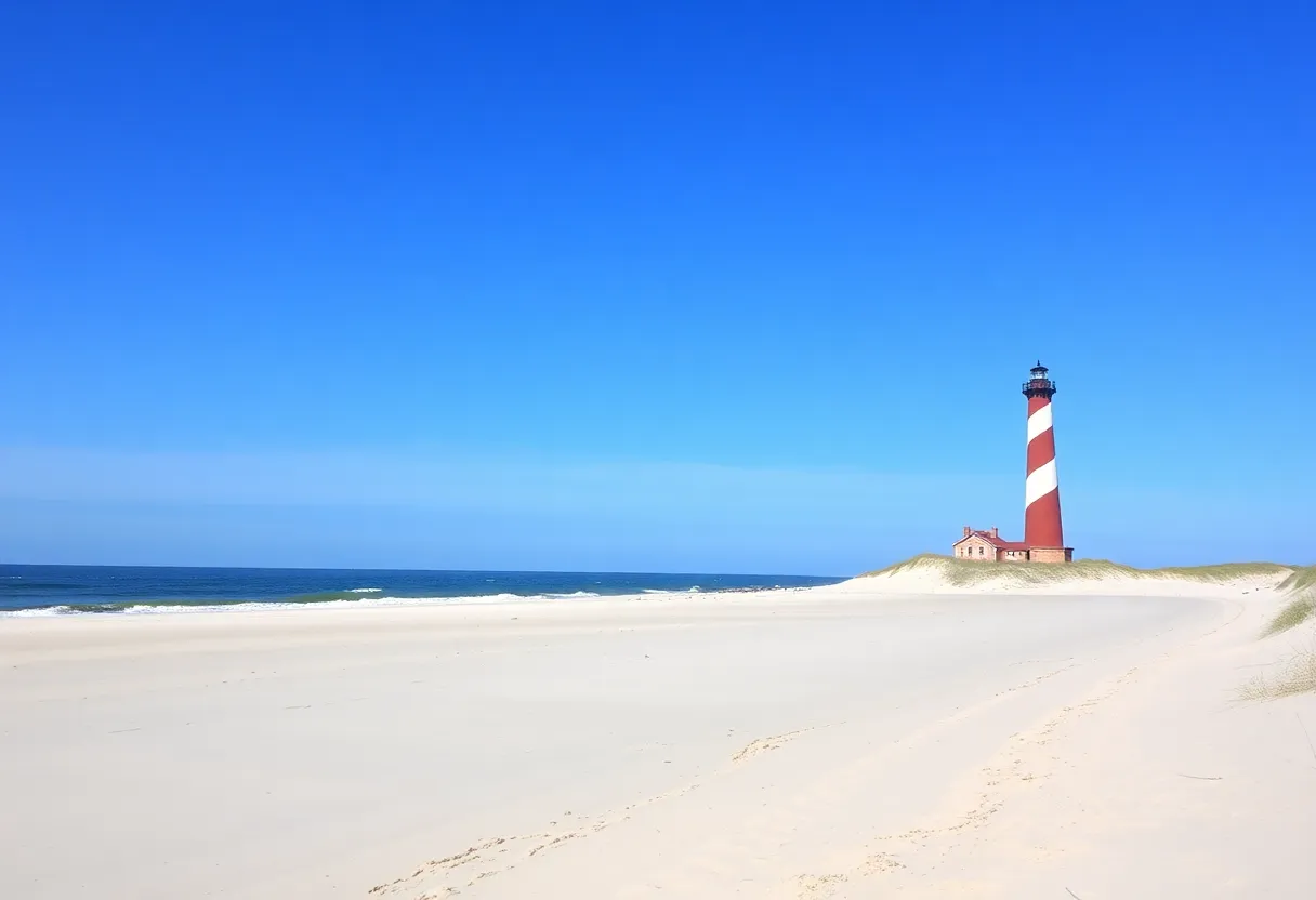 A scenic view of Hatteras Island with its sandy beaches and lighthouse.